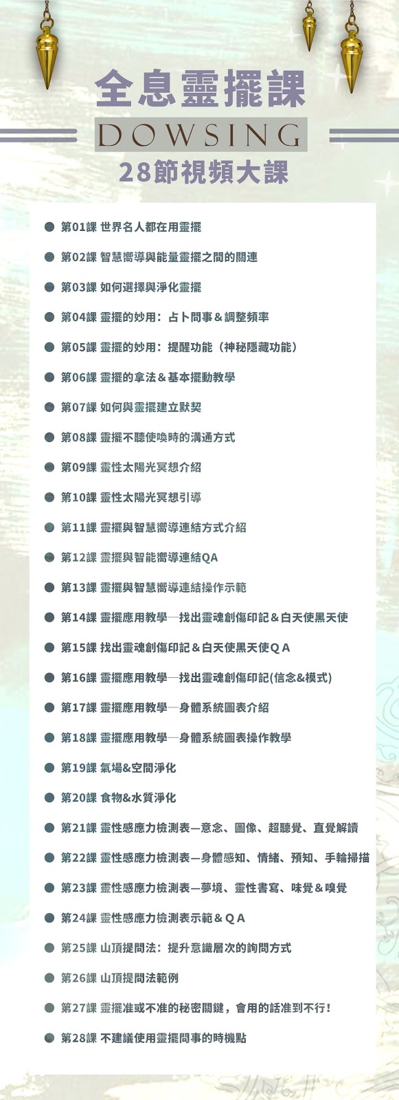 1.【不一樣的靈擺課:一個顛覆你認知的智慧工具】為付費網路課程;由於上架平台限制,本課程全系列為簡體中文視頻,如介意者請勿下訂。